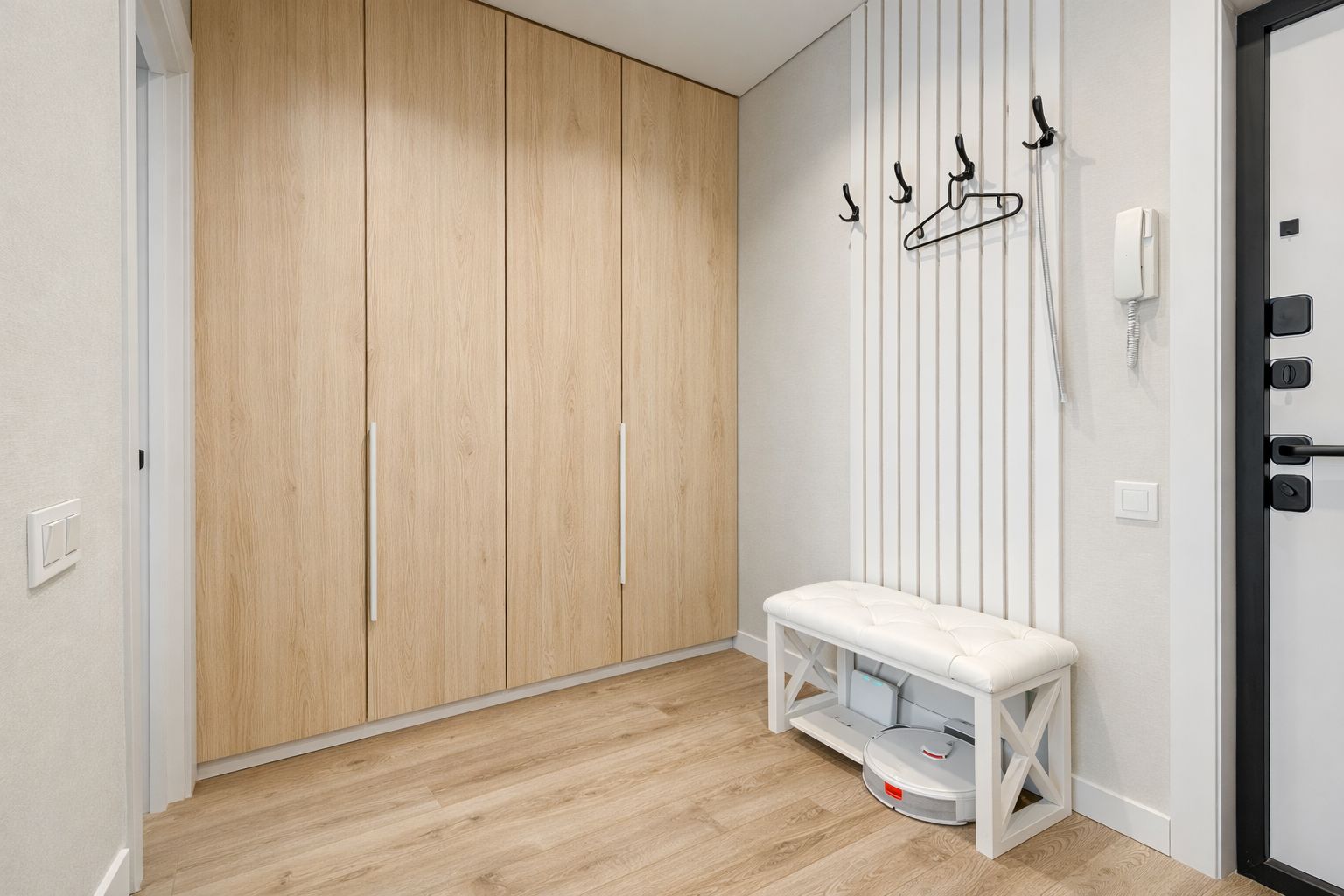 Právě tady bývá největší riziko chaosu. Boty, bundy, tašky, deštníky, klíče, sportovní vybavení. Minimalistická vestavěná skříň pomůže vše schovat a vstupní prostor díky ní působí upraveněji a reprezentativněji.